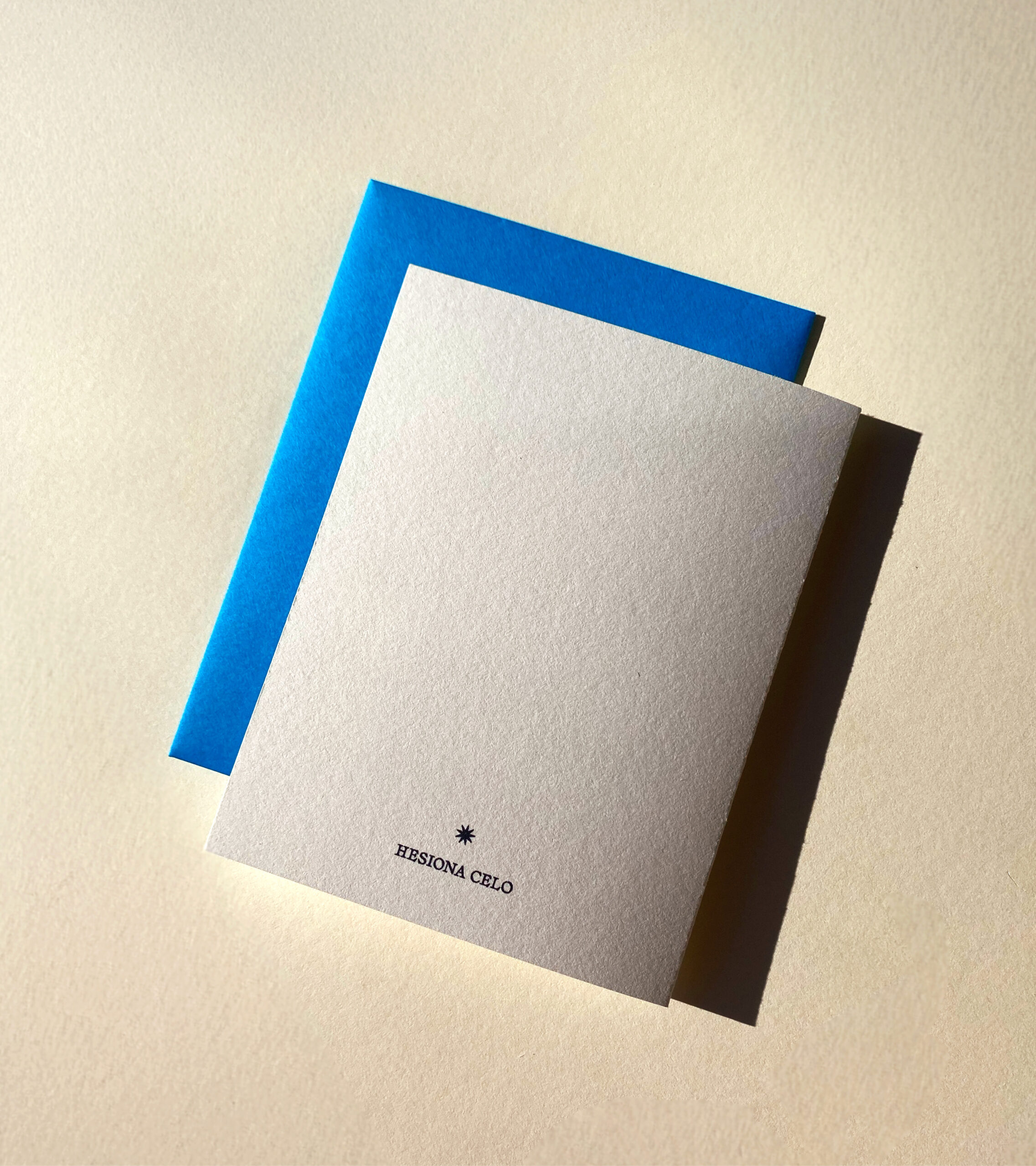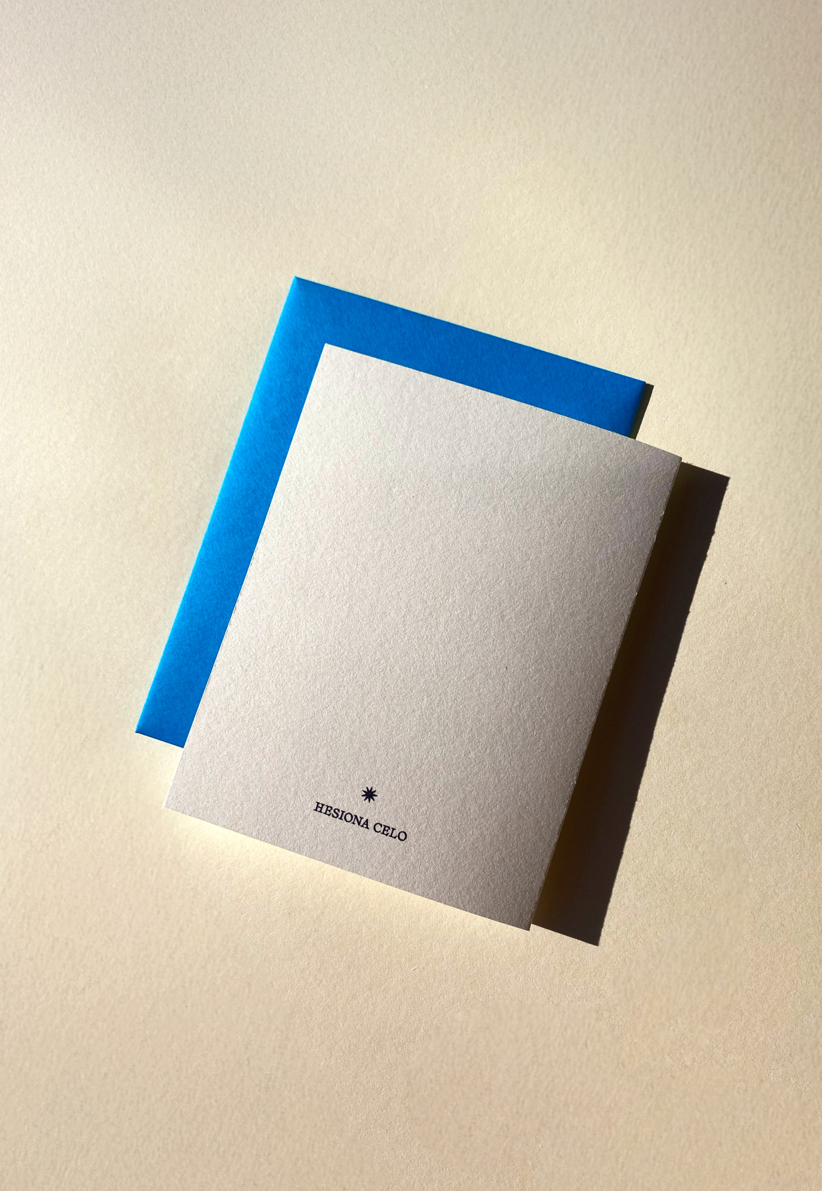 Pearl white letterpress with a corresponding envelope in cerulean blue. High quality digital printing. Handmade.