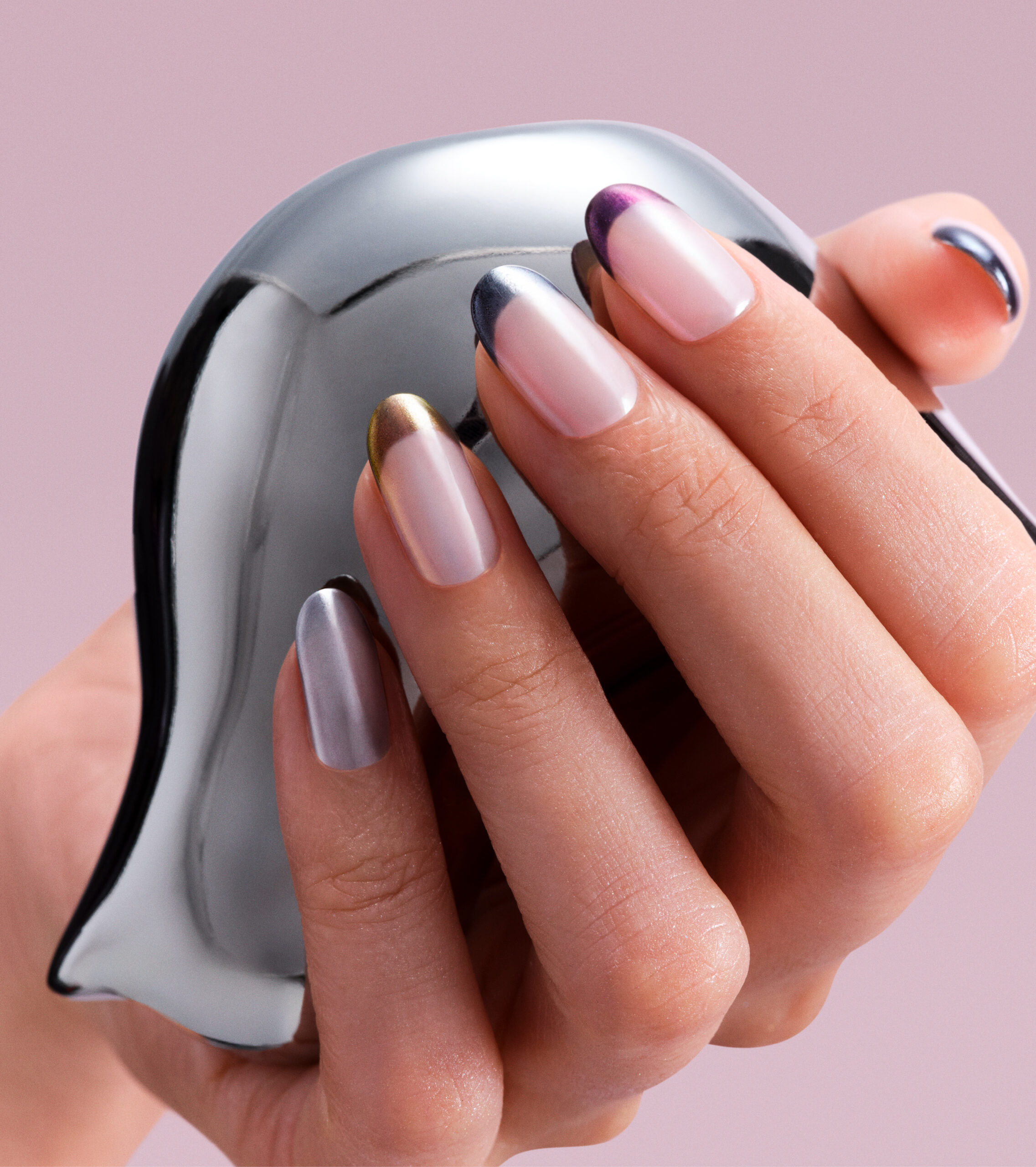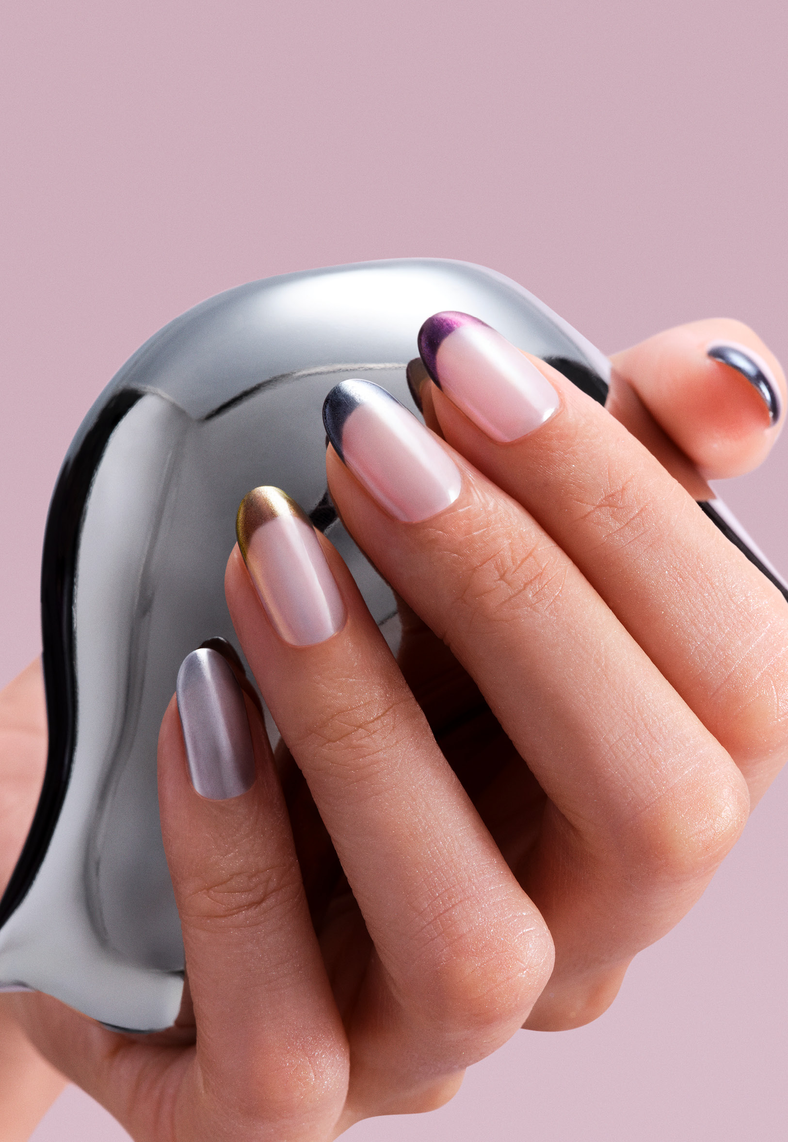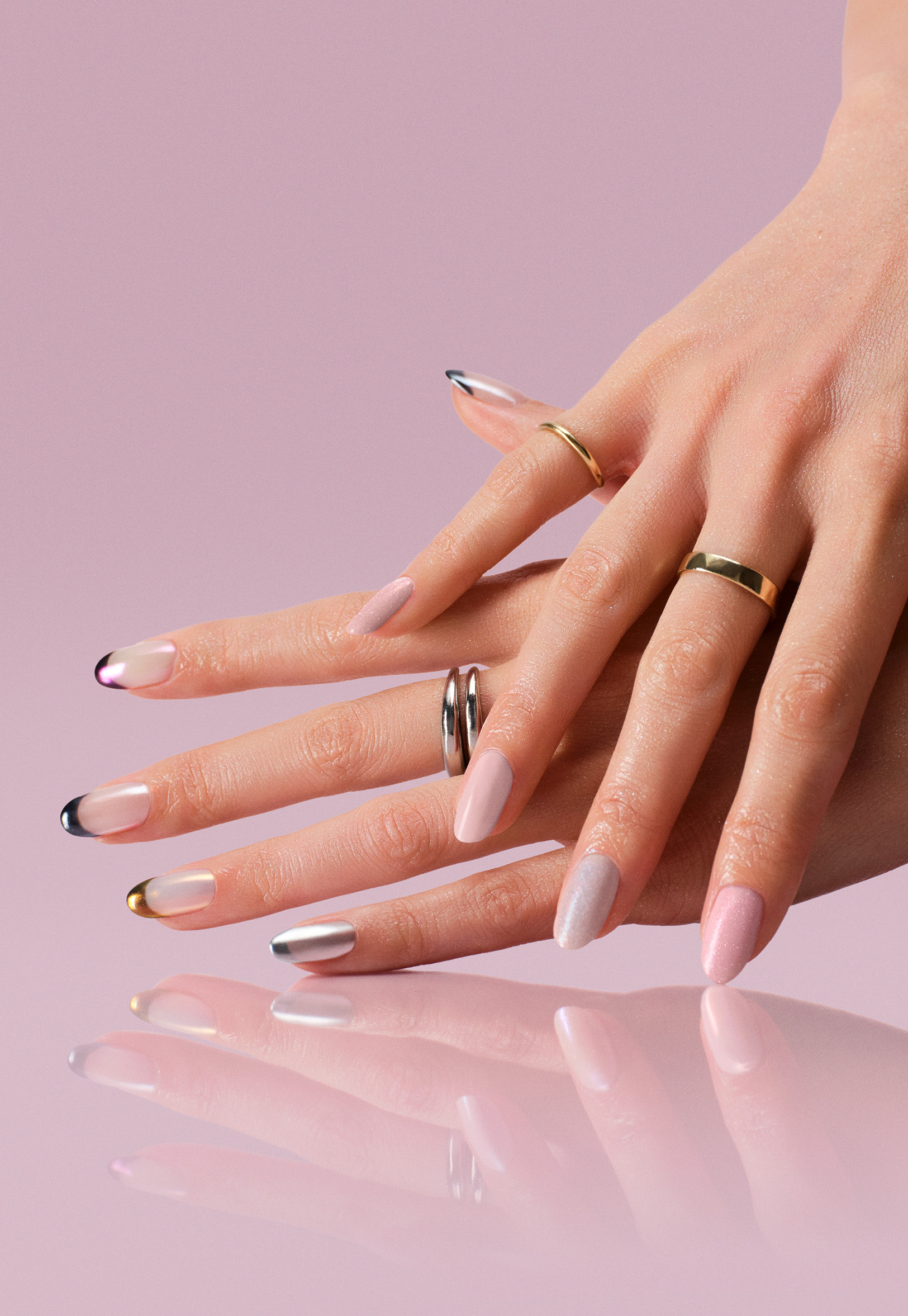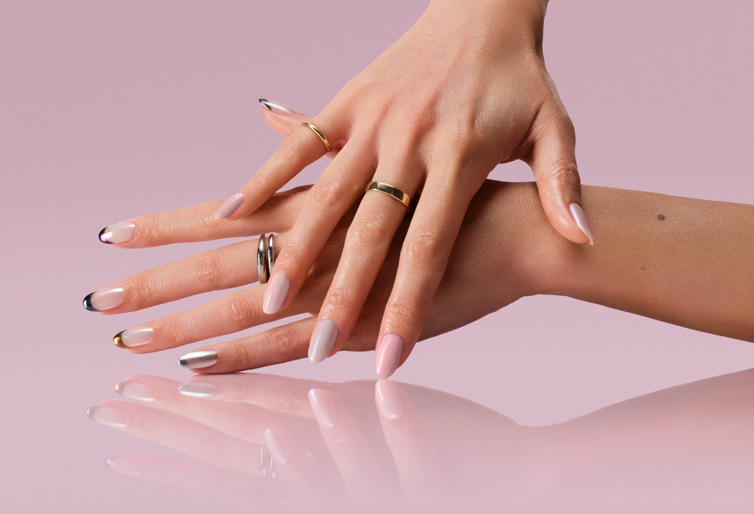 OPI's Spring 2026 color collection campaign reintroduces Chrome Effects powders with the addition of new Infinite Shine Glaze Toppers, offering two ways to achieve the viral ‘glazed donut’ manicure look. Chrome Effects powers for a full chrome mirror-like shine or glaze toppers that deliver a pearly, light-catching iridescent sheen.